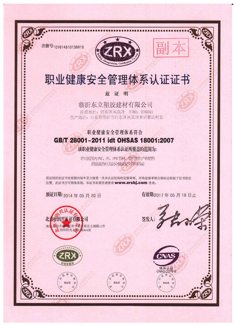 職業健康安全管理體系認證證書